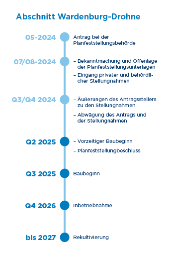 Die Arbeiten an den dem Leitungsabschnitt Wardenburg-Drohne (WAD) des Leitungsbauprojektes Etzel-Wardenburg-Drohne schreiten stetig voran. Wo steht das Vorhaben aktuell? Wie sieht der weitere Ablauf aus und wann sind die nächsten Schritte geplant? Unsere Infografik und der begleitende Text geben Ihnen einen umfassenden Überblick.